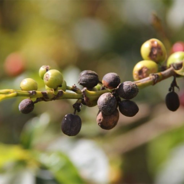 • Tiến triển: Vết bệnh lan rộng nhanh chóng, bao phủ toàn bộ vỏ quả, khiến quả chuyển sang màu đen khô cứng (khô quả) hoặc thối nhũnrụng non hàng loạt. Quả bị bệnh nặng thường có nhân đen, làm giảm nghiêm trọng chất lượng hạt cà phê thành phẩm.