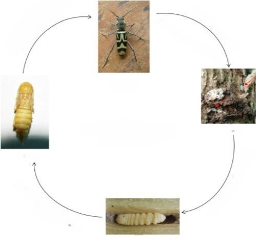 - Trưởng thành đẻ trứng vào vết nứt vỏ cây. Sâu non nở ra đục ngay vào vỏ và thân cây, tạo đường hầm ngoằn ngoèo sâu vào gỗ, đứt mạch dẫn dinh dưỡng và nước. Chúng có thể sống lâu (7-8 tháng), gây phá hoại liên tục.