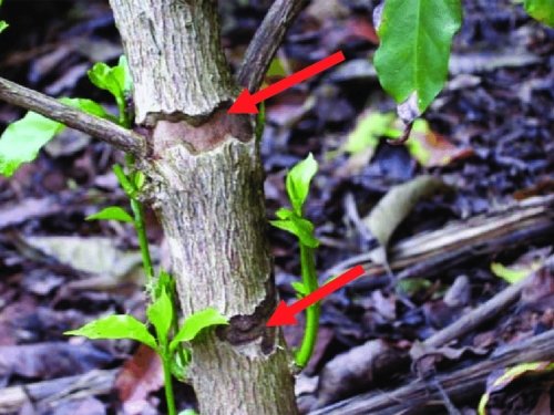 - Trên thân hoặc cành: Xuất hiện đường lằn nổi theo vòng, vỏ nứt nẻ, lỗ đục nhỏ (đường kính 2-4 mm) với bụi bột (mùn cưa) và phân sâu đùn ra xung quanh.