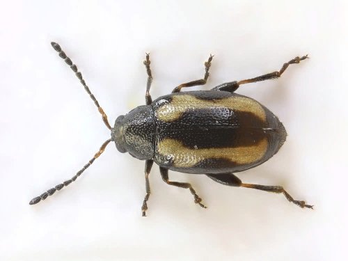 - Bọ nhảy có hình bầu dục, dài 1,8–2,5 mm, thân đen bóng, mỗi cánh cứng có 2 vạch sọc vàng cong hình củ lạc.