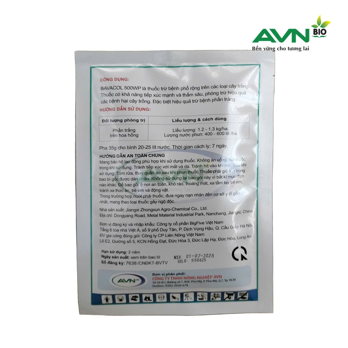 BAVACOL 500WP là thuốc trừ bệnh phổ rộng trên các loại cây trồng. Thuốc có khả năng tiếp xúc mạnh và thẩm sâu, phòng trừ hiệu quả các bệnh hại cây trồng. Đặc biệt hiệu quả trừ bệnh phấn trắng.