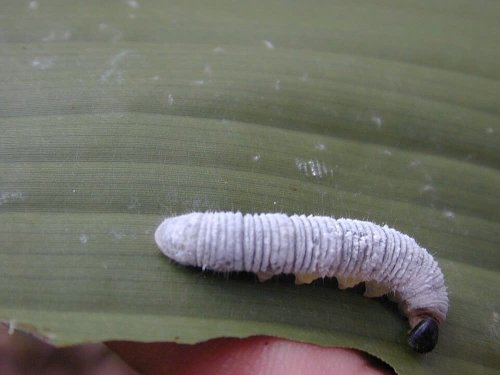 Ấu trùng non có màu xanh nhạt giống lá chuối hoặc trắng đục, dài 50-65 mm, đầu đen cứng với miệng gặm nhai, cơ thể phủ lớp phấn trắng hút ẩm. Từ tuổi 2, thân có lông tơ ngắn, đốt ngực thắt lại như cổ. Chúng nhả tơ cuốn lá thành ống để trú ẩn và ăn.
