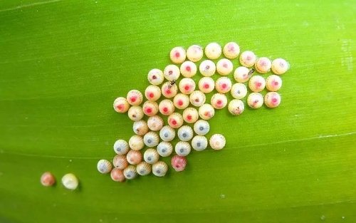 Trứng có hình tròn dẹt hoặc bán cầu, màu trắng, đường kính 1,5-2 mm, bề mặt có vân mạng lưới. Chúng đẻ rải rác từng quả hoặc nhóm 2-8 quả trên mặt lá chuối (thường mặt dưới). Trứng nở sau 5-8 ngày.